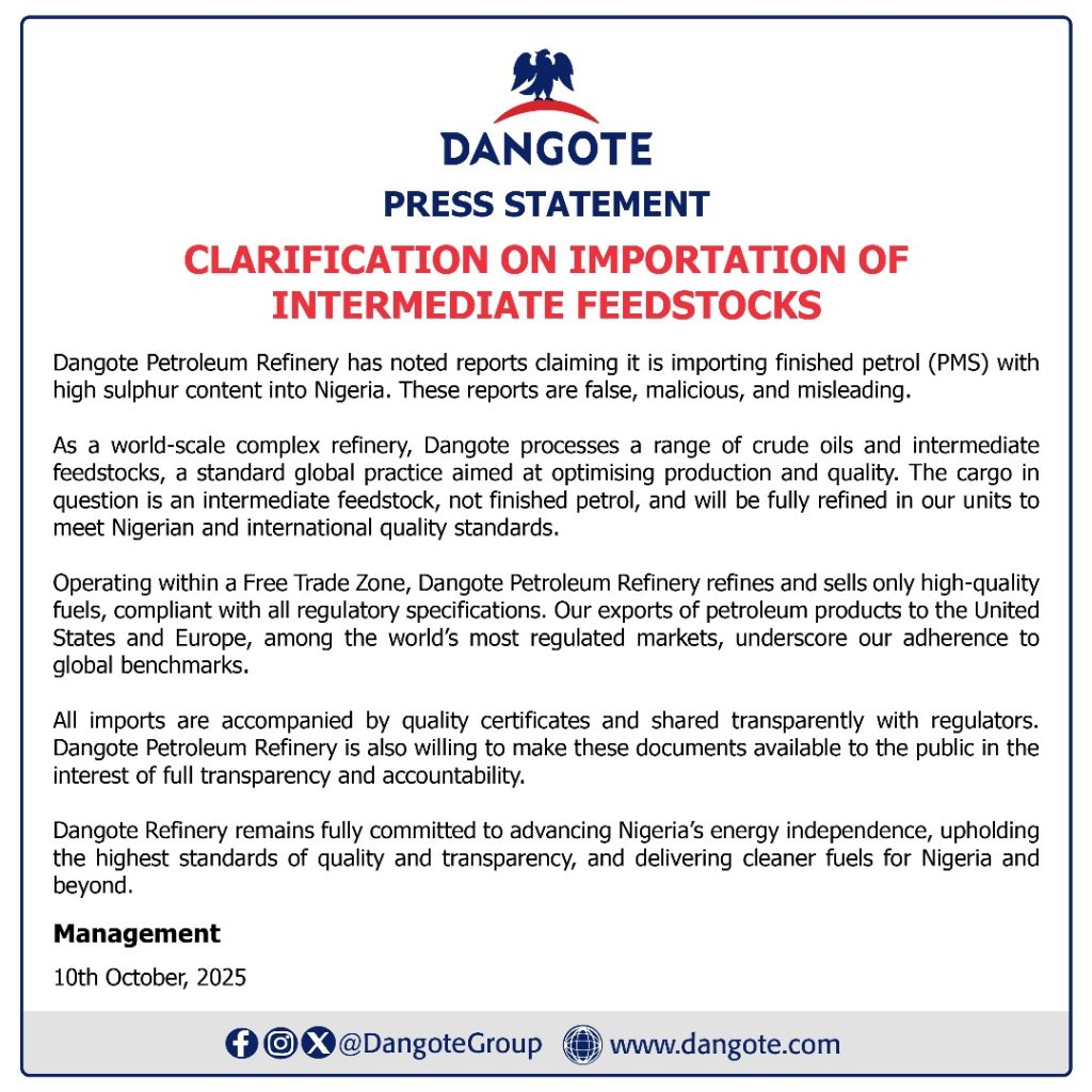Dangote Petroleum Refinery has dismissed reports claiming it imported finished petrol with high sulphur content into Nigeria, describing the allegations as false and misleading.