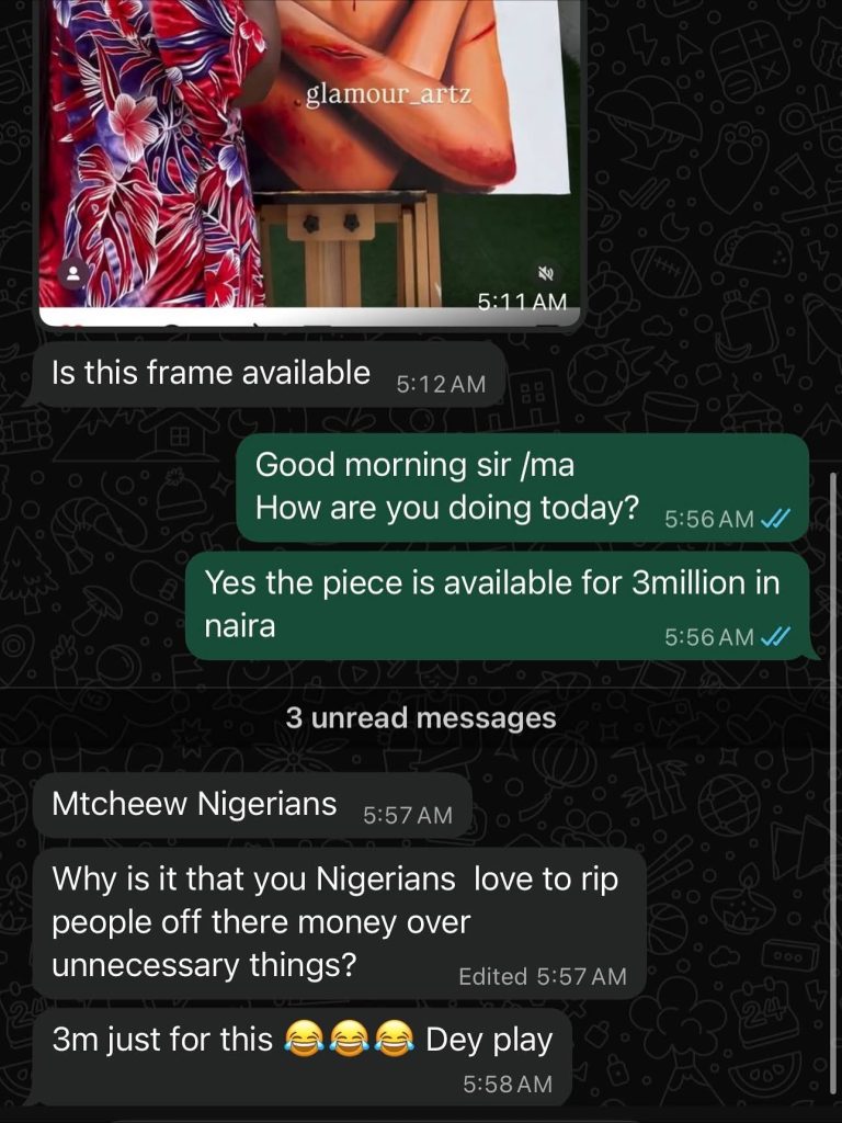Sharing screenshots of her conversations with local prospective buyers, Chiamaka revealed that one of her pieces, priced at ₦3 million, was dismissed as overpriced — a reaction she found disheartening.