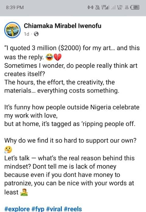 Her post has since drawn widespread engagement online, sparking a conversation about the struggles of Nigerian artists, fair pricing, and the need to cultivate a stronger culture of supporting local creators.