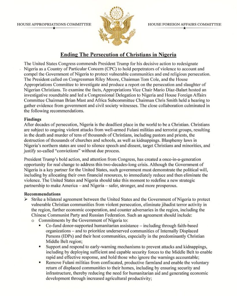 The United States House Committees on Appropriations and Foreign Affairs on Monday formally submitted a report to the White House outlining their findings and recommendations on the alleged persecution of Christians in Nigeria.