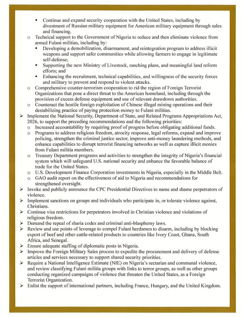 The report outlines several recommendations, including the establishment of a bilateral US–Nigeria security agreement aimed at protecting vulnerable Christian communities and dismantling jihadist networks. It also proposes withholding certain US funds until the Nigerian government demonstrates concrete action to halt violence against Christians.